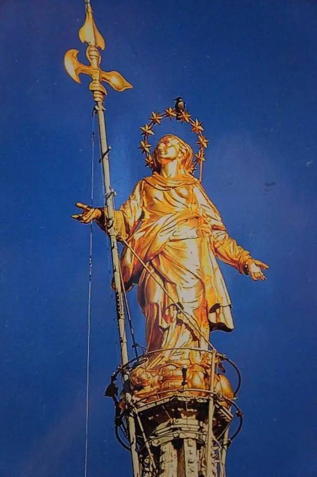 教堂敲起浑厚的钟声,伴随着人群发出的惊喜尖叫声,我看到了大教堂的标志性雕像——那座离地面一百多米高的圣母玛利亚金像。迎着阳光抬起头远远望去,矗立在最高塔尖上的圣母像,在阳光下光辉夺目,神奇而又壮丽。