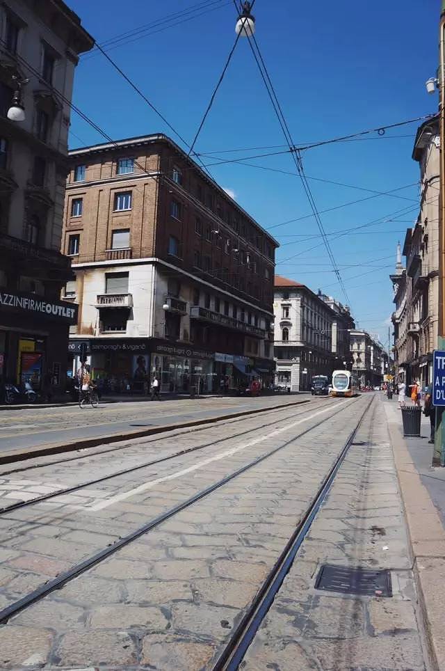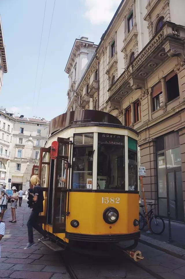 脚下的小铁轨交叉纵横,一直延伸到看不见的地方。鲜黄色和鲜红色的电车哐当哐当地开过,像是摆放在甜点托盘中的整齐饼干,仿佛随便选坐一辆,就能带我进入童话世界中。于是,为了乘坐它,让我想在米兰待上一天。我搭上了前往米兰大教堂的电车,刚上车,车的铃铛就响了起来,老电车哐当哐当地向童话的目的地驶去。