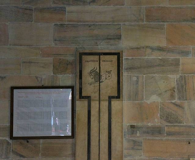 摩羯座标志下面画有一条细细的铜线,一直穿过教堂大门,延伸到对面墙壁上,讲解器里说:这就是日晷,也叫“太阳钟”,和中国大圆盘上放了条指针的日晷作用相同,古人以此计时。