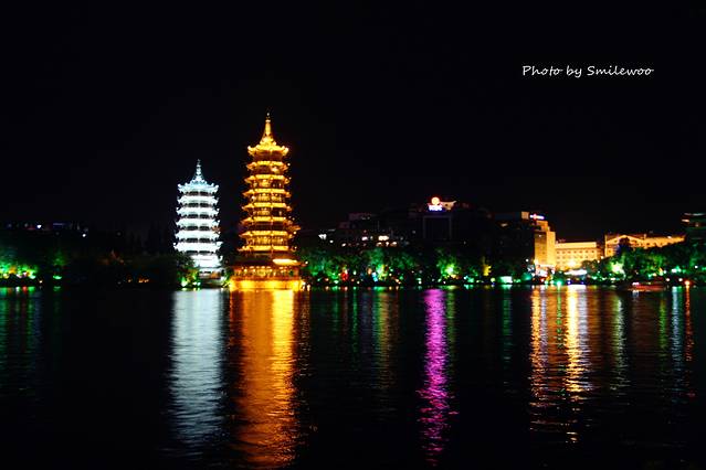 正阳路步行街的尽头,桂林大瀑布的门口就是日月双塔文化公园,这里可以夜游两江四湖。两江四湖是指由漓江、桃花江、榕湖、杉湖、桂湖木龙湖所构成的桂林环城水系,是桂林城市中心最优美环城风景带。