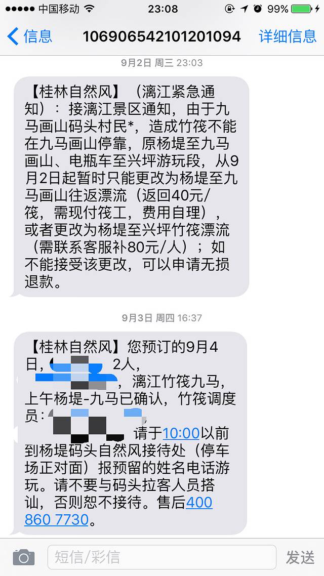 来桂林前收到短信说9月2日起九马画山码头不让停靠,要么退款要么补钱改变行程,想着居然这么倒霉让我们赶上了,可也许来桂林就这么1次,怎么滴也得漂一次,加钱就加钱吧!