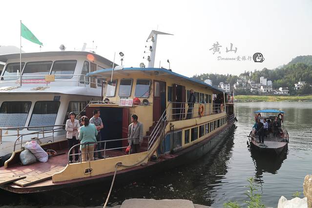 新安江风水画廊,沿着当年徽州人经商的水路,跟随诗人们最喜爱的游船方式,从歙县深渡镇码头到千岛湖客运码头。每天两趟7:40、11:30,票价60元(不分上下舱,推荐坐上舱),5小时船程。我们乘坐的是黄色的客运船,并不是旁边白色的豪华观光船。主要区别是客运船途中有停靠的站点,在千岛湖不上岛上游览,而且价格便宜,更能感受民风。