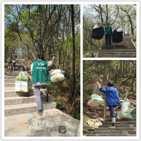 黄山的挑夫,真的令人佩服、很聪明,用两条竹竿作做支撑来休息、抬货物,技术活啊