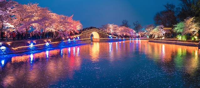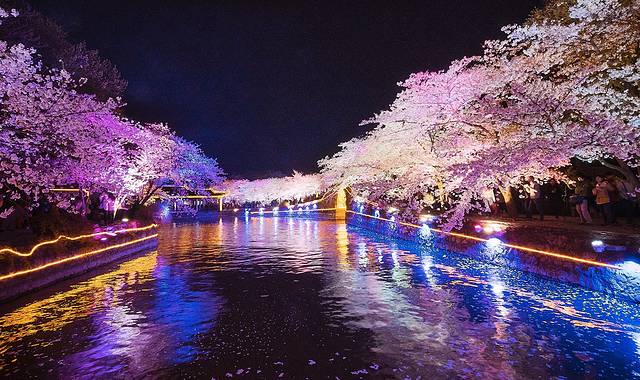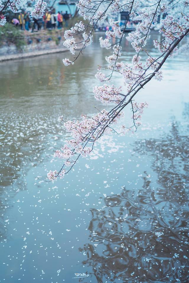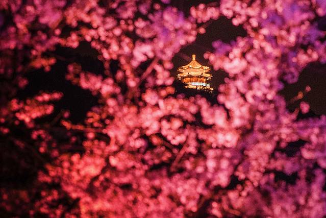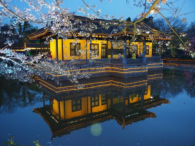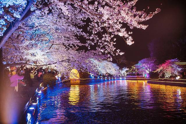 夜赏夜樱:提前占好位置,拍好立马换位置。注意安全,小心掉落湖里。