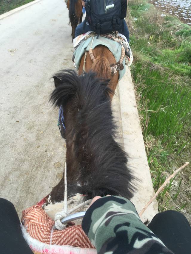 很不幸的,进入了一个脾气比较差的马夫的团队里。这里是四只马一个团线,马夫在前面走,我们在后面跟着走。这马也不会跑,只会慢慢的驮人前进。