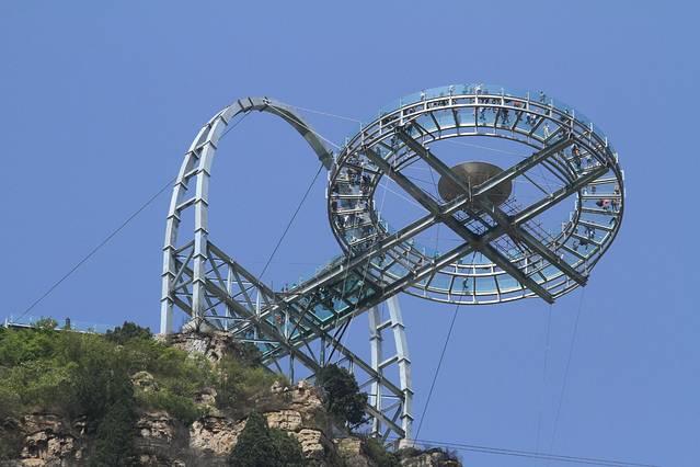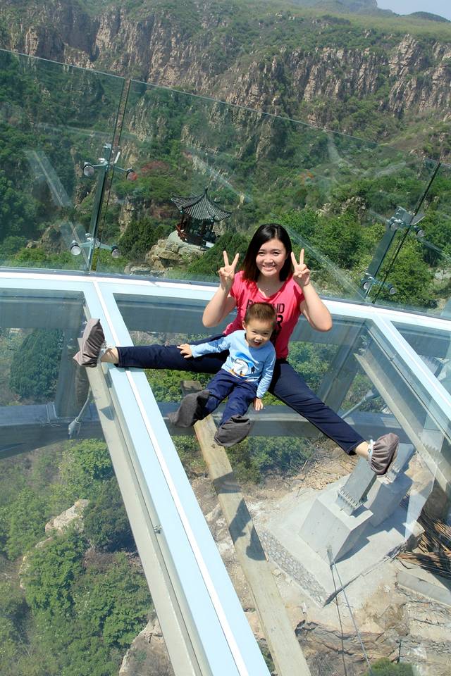 坐缆车上来的时候就能看见玻璃大圆盘了。激动又有点小担心,前恐高症患者为了证实一下病好了,特意报名了这次活动,再说在儿子面前不能怂!要做最勇敢的妈妈。