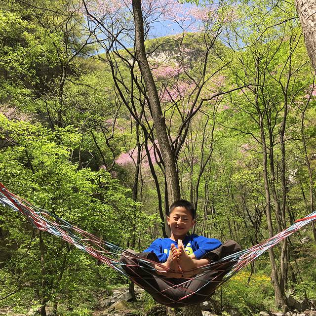 连续五天高强度的工作,需要适当的养疗。丁猫粑粑强烈推荐西寺沟一日游。一家三口约上带上小妹和wuli公举,一个半小时车程,西寺沟。🚗还没有来到西寺沟,迎接我们的是漫山遍野的紫荆花,搭配着嫩绿,美极了!西寺沟门票五元,超值!一路没有开发留下的痕迹,基本是保持了原始的美!当然路不好走,特别是前一天刚下大雨,河道的水涨了很多,🈶️几处是躺着水踩着石头过河……所以一定传一双合适的鞋子……到第二个大本营河水基本到成人膝盖……我们就地挂了两个吊床,享受生活!上图!