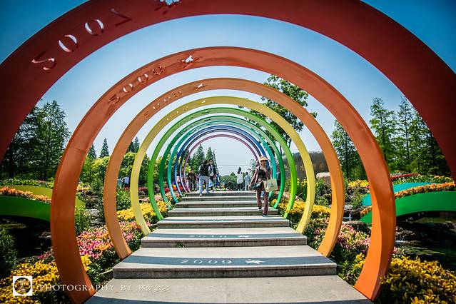 从花展的2号门进入,是一个拱门形的“时光隧道”这是荣获本届花展主题类景点类铂金奖的作品《十年感恩》。在“彩虹”时光隧道中拾级而上:石榴红、柑橘黄、明亮橙、樱草黄、碧玉青、孔雀绿、宝石蓝、牡丹紫、葡萄紫,十种缤纷色彩构建出的“彩虹”隧道,每一道拱门镂空处分别刻有2007-2016年份字样,镂空处投射下的光影,让人回忆满满。
