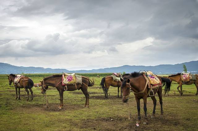跟的客栈自己组织的旅行团,后来才知道价钱贵了许多,不过骑马走了遍真正的茶马古道,而不是骑马压马路,崎岖的山路中倒也刺激,泛舟湖上,景色也很漂亮。只是天公不作美,原本晴朗的天气骑完马就阴了,有些遗憾