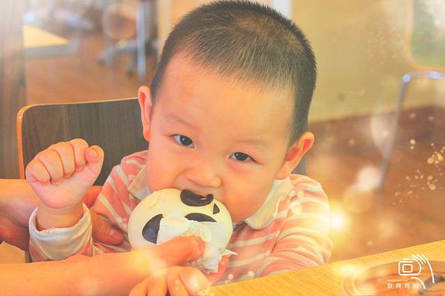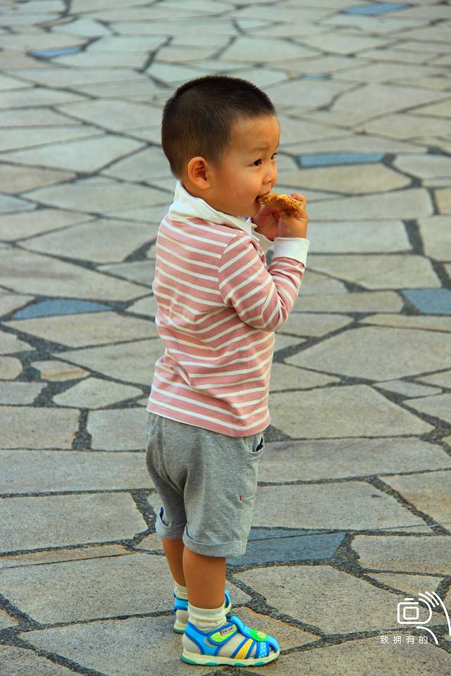 津津有味的吃着咖椰土司,这是在摩天轮下面,等去动物园的大巴车。