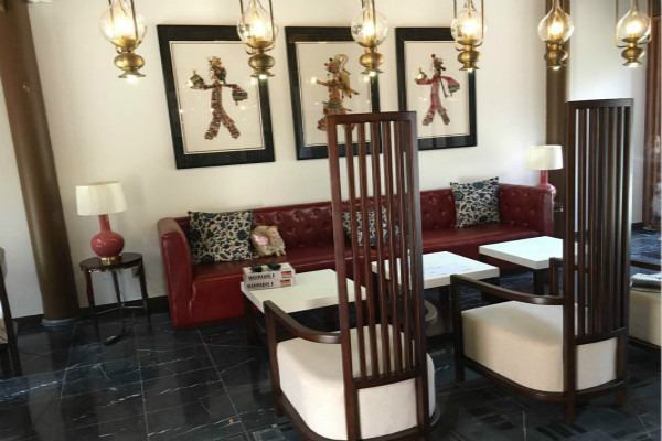 大厅的墙上是平遥有名的皮影匾额,灯是古时候煤油灯的样子,意境很不错。这椅子靠背也是设计独特,坐上去软绵绵的,地板也正映衬了复古的氛围。