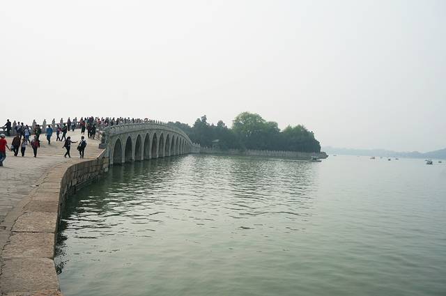 从万寿山下来,就来到了昆明湖。昆明湖静得像一面镜子,绿得像一块碧玉。游船画舫从湖面慢慢地滑过,几乎不留一点痕迹。昆明湖上的石桥是著名的十七孔桥,因为一共有十七个桥洞。桥上有上百根石柱,每根石柱上都刻着小狮子,这么多小狮子,没有那两只是相同的。湖中心有个小岛,我们过桥可以到岛上去玩,风景怡人。