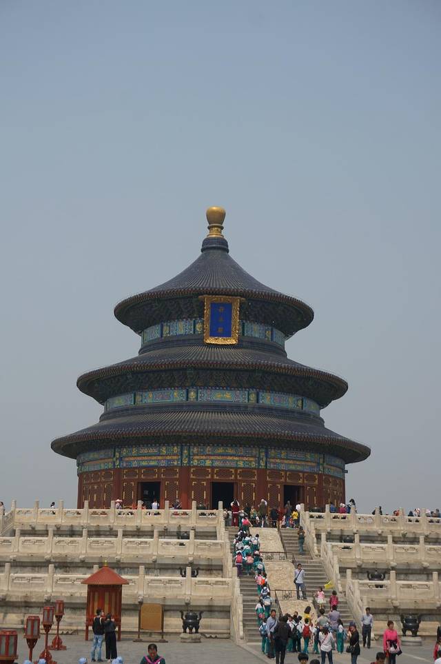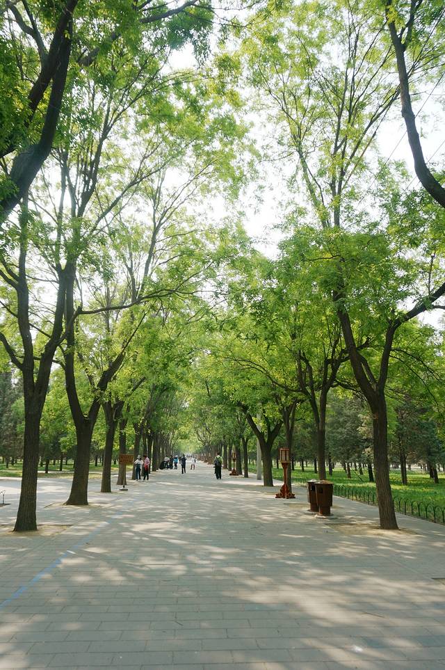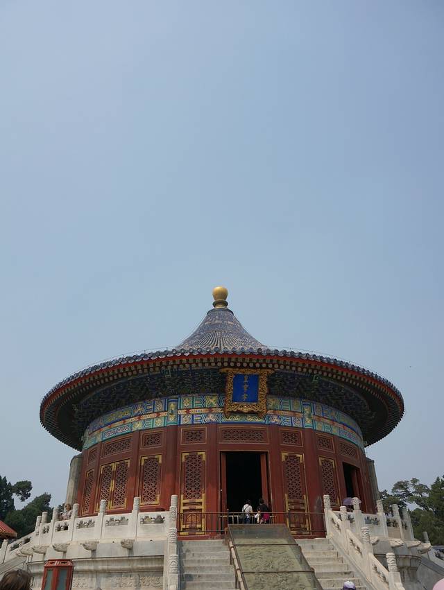 明朝永乐皇帝在北京南城仿照南京的大祀殿建立了这作用于祭天的圣坛,主建筑是大祀殿,也就是今天祈年殿的位置上。天坛有外坛墙和内坛墙,北面是圆形,南面是方形,取意天圆地方。雄伟的祈年殿是北京的标志之一,祈年殿是圆形的建筑,他最大的特点是整个殿都没有横梁。
