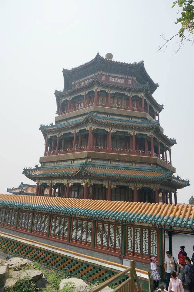 穿过长廊,我们就来到万寿山脚下,在半山腰间耸立着一座八角宝塔形的三层建筑物,那黄色的玻璃瓦闪闪发光,那就是佛香阁。它的下面就是排云殿。