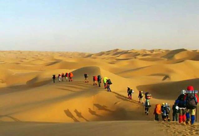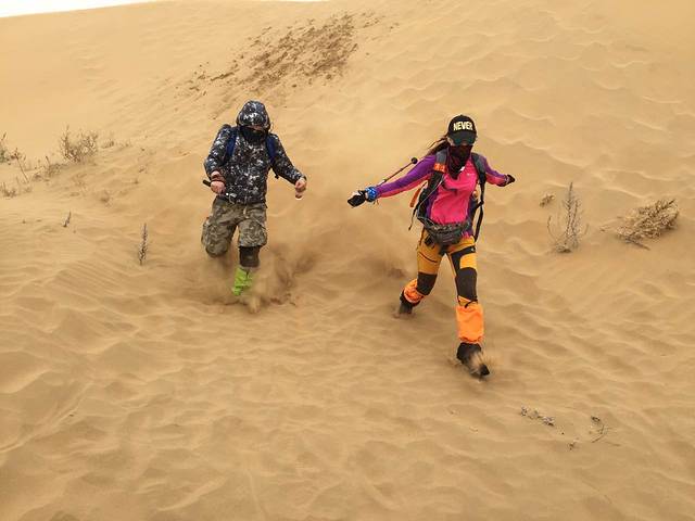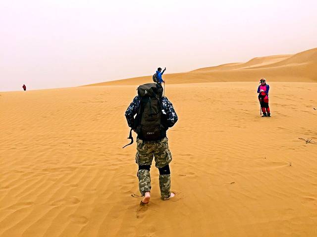 继续走,除了风沙,另外一个难题就是鞋子进沙,沙套对我来说没啥用,大概是我登山鞋是低腰的,我不说低帮说低腰会不会显得登山鞋好性感?基本上十分钟鞋子就需要倒一次沙,但是团队进度不可能给你十分钟倒一次沙的机会,而且穿脱沙套和鞋子,很费时间,何况还背着大概四五十斤的登山包,一直忍着,短暂休息时倒沙子,倒完还是觉得和没倒一样样,一想,真是呵呵,进了袜子里了,如果你们以后去的话,可以买那种防雨鞋套,整个鞋子包起来再带沙套就会好很多很多。因为有一个东北的姑娘,就这样穿的,我看她穿梭自如,她说她叫不二,富有东北姑娘的美丽和热心。在我看来东北姑娘和北方姑娘还是有区别,不少北方姑娘会有小麦色的皮肤,就像黄土高原上成熟的麦田,让你觉得喜悦和真实,而东北姑娘很多就很白皙,就像东北的雪,若能靠近便会为你融化、更是水灵。