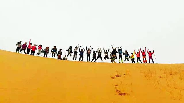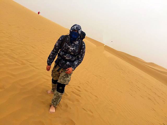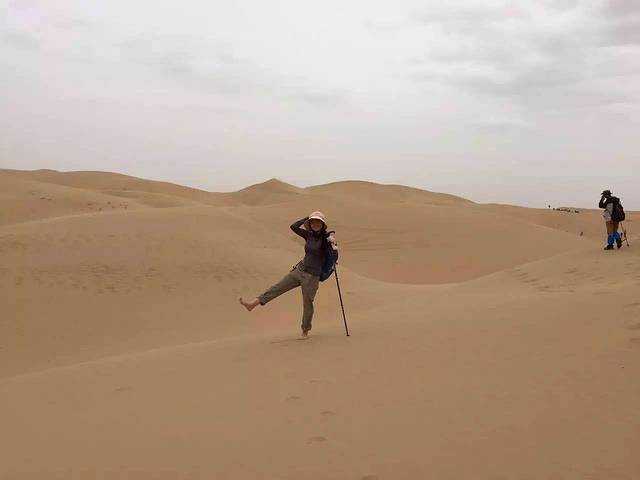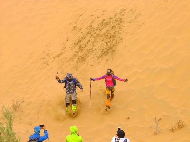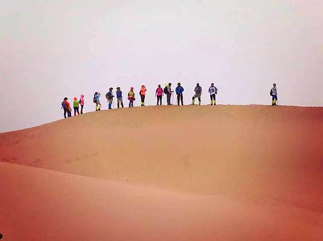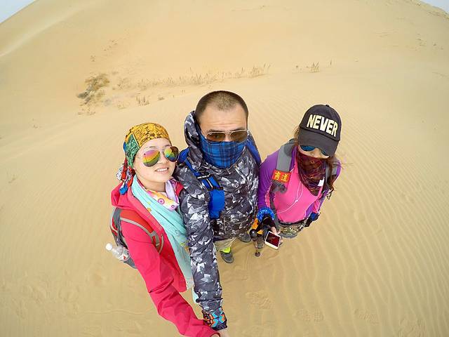 风真的很大,以至于我丝薄的皮肤衣被朋友当成是羽绒服,眼睛鼻子耳朵嘴巴都是沙,感觉自己变成了一幅旗帜,被风吹的朗朗作响,风沙打在身上,其实这个声音挺好听的倒是,白噪音嘛,你会觉得你特别渺小,天地之间只有你和沙,而沙可是比你多的多,站在沙丘顶端,看着沙子随着风去形成一个新的形状,感觉挺奇妙的,我写这段话的时候,我已经回到了当时,心里也是充满了奇妙和回忆的,这时你要说苦不苦,也苦,但是心里是兴奋的,为什么,因为你从来没有经历过,新奇的感觉是最美妙的你听体验,我说也只是听说,如果能够亲自感受到,那种极端的体验一定会刺激你肾上腺素分泌。我跟旁边的姑娘说,应该带风镜来,眼睛迷的睁不开了,她说没有啊,眼睛还好。我说好羡慕你们眼睛小的。胳膊现在还隐隐作痛.走在沙丘顶端,风大的时候,真的是摇摆不定,上帝给你关上门就会给你开窗,虽然我眼睛大迷了沙子,还好长的胖吹不动我。有几个瘦瘦的团员,不知道落下来没,好担心。