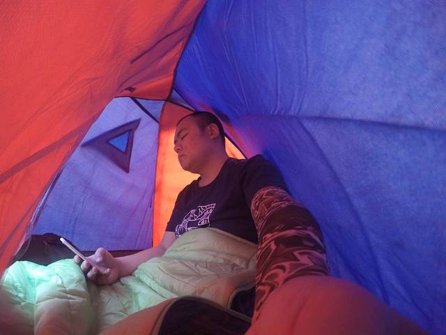 拿了帐篷、防潮垫、睡袋,开始扎营,心凉,自己都嫌小的帐篷还是双人帐,这一天来,Ms小阿姨一直都照顾着我,扎营时也让我挨着她的帐篷,她和另外一个姑娘住,因为我和她说话,不知道是反应迟钝还是在自己稳定的结界里,反正回复挺慢,所以我就叫她高冷静,她倒挺喜欢这个名字,我说高冷静,我住这个帐篷太小,换到你们这个大帐篷里吧,她一副过来人的样子笑我想的美。可是我真的是嫌帐篷小。