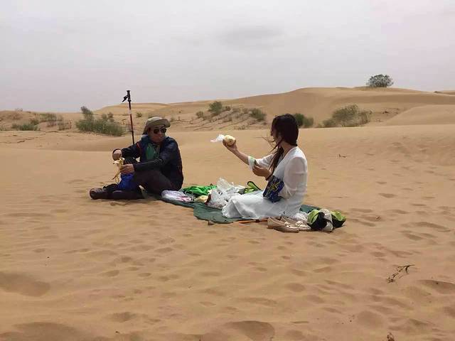 午饭是真的饿了,上午不停的行走,必须补充体力,就着沙子好消化,多餐少食这是大智慧,不只是减肥用,沙漠也适用,这样不会让你消化系统有过重的负担,也可以维持血糖的恒定。如果你要来,我的简易是,蔬菜瓜果多带些,然后就是牛肉烧饼,我带的烧饼是锅盔,特别瓷实的饼,蔬菜瓜果是因为你需要补充维生素,我们不少人手指都起了肉刺,指甲位置干裂,其他华而不实的反正我是不喜欢,一大包一大包又没营养干巴巴吃了又上火的东西,说到这,妈蛋这一趟又长了几个豆豆。