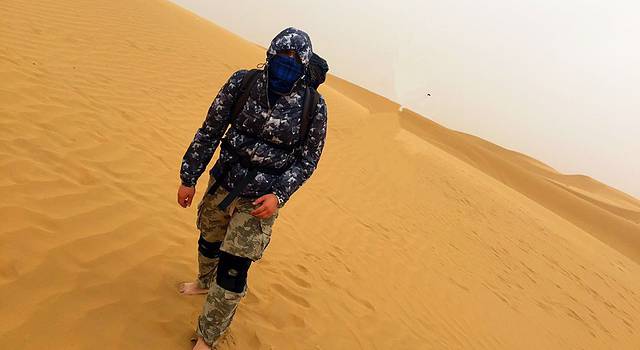 今天的行程长,午饭也是在沙漠,全程无补给,所以水得计算着喝,我又坚决不允许水不够,所以今天还是背了20斤的水。今天相比昨天,行进速度还是快了许多,因为昨天休息的肯定比车上休息的好,少了新鲜感和各种拍照,除去发朋友的,留下来穿越的都是热爱徒步和这片沙漠的。上午就是穿越,不过今天的沙漠因为走的深,这才是我们在电视和图片上看到并且想感受的那种沙漠,一望无边,没有风的时候,她是那么沉静安稳,毫无波澜;风起时,风沙肆虐,疯狂无情。如果你和我一样热爱这样的矛盾,我也会深深的爱你,然后送你一次请我吃饭的机会。