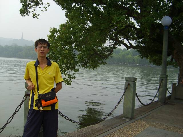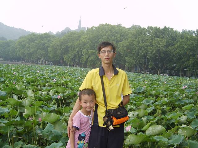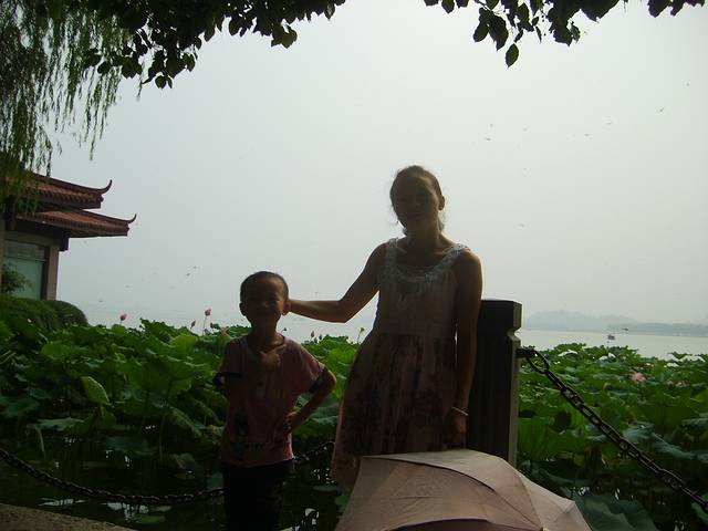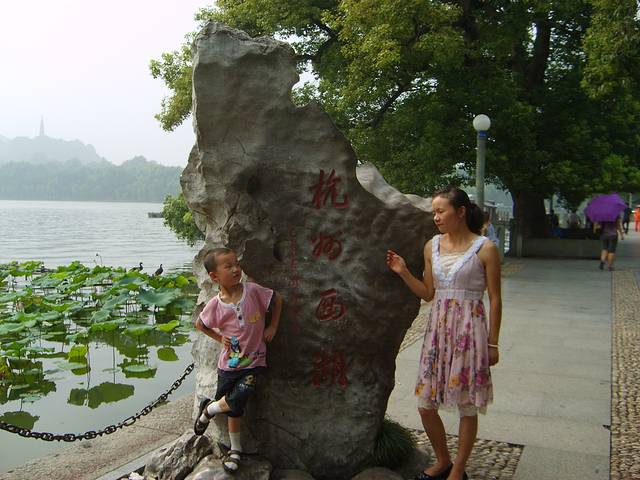 整个西湖分白堤,苏堤,雷锋塔,栈桥,老八景,新八景,沿湖景观太多了,没有一天时间是欣赏不了。时间充裕可以租辆自行车慢慢骑行,穿行在白堤或苏堤之间,在绿树掩映中尽情舒发,也可以做环保车沿湖依景点下车,费用各不相同,全程好象是50元吧,环湖有几十公里了。漫步在苏堤间,遥遥望去,雷锋塔耸立在,而白娘子艰守塔底为了艰真爱情,官人儿子叩拜最终感动,“雷锋塔倒,西湖水干”传承一段佳话,这也是孝心所在缘故。因去时下雨,湖水泛黄发混,但依然没有影响,湖面荷花成遍成遍,绿油油,光亮亮,蜻蜓点水满天飞,牵起儿时回忆,路过栈桥时,想起许仙白娘子相会之地,难道就是这样呢?一座很普通很普通的桥,却引起大江南北,全国轰动,电影电视传播威力影响力太大了,桥面不宽也不长,也没有特色,可人却不少了,沾沾光吧,留影个吧。湖面有国营游船,有个体渡船,取其所需了,做船可看三潭印月,蛮不错景点。沿湖面一路走来,与我心目中西湖大大折扣,也许是看电影电视习惯了,过于修饰玩美,而现实却这样,有股失落感,什么新八景,老八景,可能都是这样吧。实在走的太热,寻个亭子下,沿湖边把脚放进水里太舒服,好多人这样,看来我们文化需要提高,太不美观了。