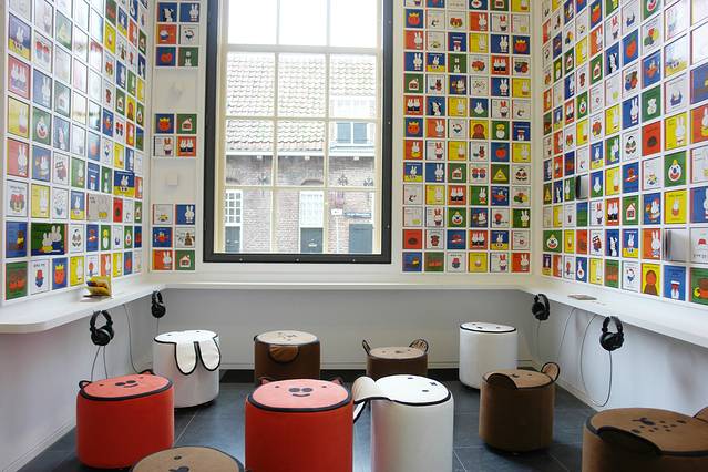 迪克·布鲁纳故居或许被称为米菲兔之家更为恰当。米菲从1955年至今是如何成长的,米菲是如何诞生的,迪克是如何绘制出米菲的,关于米菲的故事统统都汇集在这里。拐角处的阅读室内,《米菲在海边》、《米菲在动物园》、《米菲的梦》、《米菲去露营》、《米菲女王》等数百本米菲的图书铺满了整个房间的墙面。取下一本坐下来慢慢翻看,寥寥数笔勾勒出米菲的喜怒哀乐,简单的色彩描绘出简单的故事,如同一个邻家的小孩子,令人感到温暖与美好。走进活动室,墙上用各种文字写着“欢迎来我家做客,米菲”。进入米菲的小房子参观一下它的小床,小凳子,或是看一会儿米菲的动画片,或者跟米菲和她的小伙伴们一起做游戏。在米菲的家,不用保持安静,孩子们可以尽情的玩,做他们所有喜欢的事情。