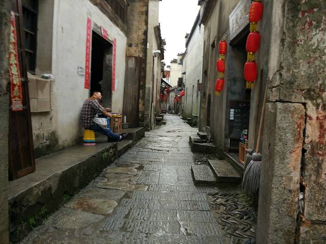 ⑥五点左右到达汤口村,小伙伴去做了足疗,简直是个英明的选择,可以考虑(我从黄山回到北京后一瘸一拐了好多天,就一直后悔没去足疗的这件事好嘛/(ㄒoㄒ)/~~)。我因为在山上把包弄坏了,就在村子里逛逛,打算买个便宜的双肩包,能让我坚持到回北京。在村子里逛的时候,发现村子里面,从一些胡同里面进去,就能看到很多古香古色的特色建筑,还可以买些烧饼(5毛一个,包装盒包装好的大概20元左右),茶叶(当地盛产的好像是绿茶毛峰什么的,装一瓶根据装的茶叶的不同,价格不同,通常也不超过100)什么的带给朋友们。