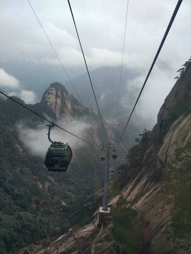 ⑤这里说一下,我们的山上路线。(上山起码要先规划好路线,带上地图,带好小伙伴哟,要不很容易在山上迷路,天黑了下不来了。。。保存好客栈老板之类当地人的电话号码,有问题及时打电话咨询还是极好的,山上信号不错,微信电话都能用)经过前一晚跟客栈老板的讨论,我们决定当天上山,当天下山,主要路线放在景点多的前山。计划的整个路线是,大巴→慈光阁→(玉屏索道缆车)→玉屏站→百步云梯→海心亭→白云宾馆→光明顶(当时开启的山峰中的最高峰)→飞来石→西海大峡谷的一环、二环→西海观光缆车100元→百步云梯→玉屏站→迎客松→天都峰→慈光阁→大巴19元(提前问好老板在哪里下车离客栈比较近,告诉大巴司机在那里下车)。事实上,我们从早上七点一直爬到下午四点半没停下来休息过,整个人都要累趴下了,所以在看过迎客松之后就返回玉屏站,坐缆车(90元)下来了。小伙伴至今还为没看到当时开启的最陡最惊险的山峰天都峰而感到遗憾呢。
