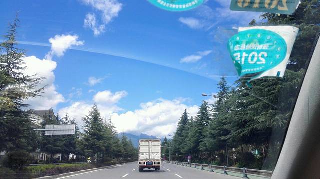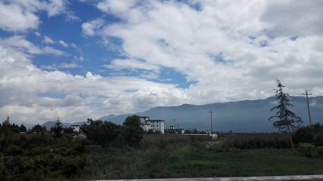 这是机场到客栈的小面包上的照片~走之前看天气预报说3-7号丽江全是雨,本以为大家是换个地方淋雨,没想到一下飞机确是晴空万里白云飘飘~