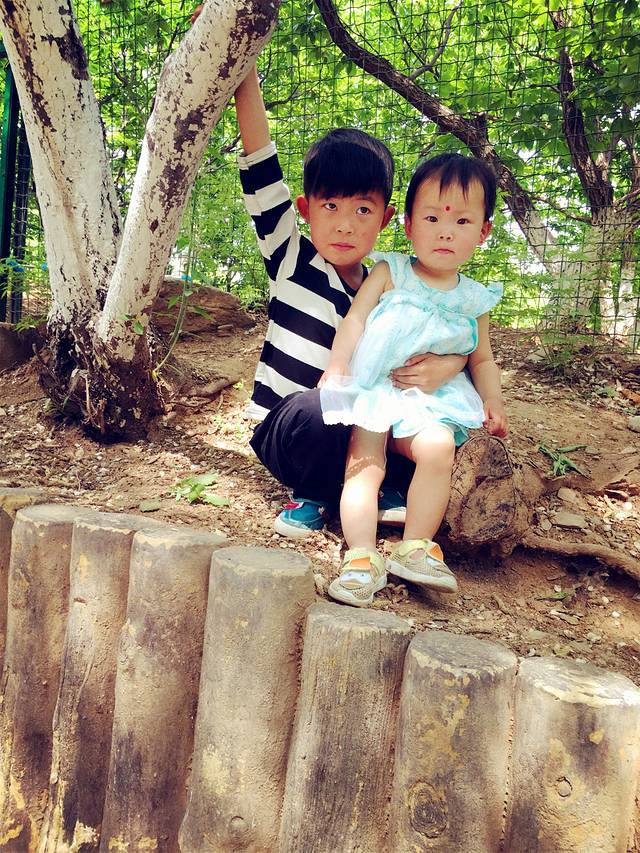 有恐高的小管家文文,一手扒着树,一手托着妹妹,紧张的要命还不忘紧紧抱住自己的妹妹....