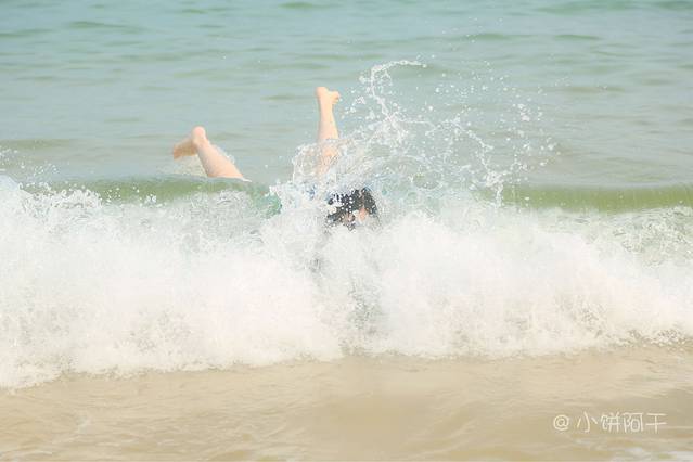 摄影师拿着冲浪板玩的正嗨,我这种游泳都不会的人看他玩得那么开心心里特别着急,教练教了我们几遍也玩去了,我们是最基本的冲浪,是整个人趴在冲浪板上让海浪把你推着走。我心里特别痒痒啊,想玩但是不敢,一狠心,结果一个浪把我打在水里。就是这个样子,咸得我眼泪顿时就出来了。