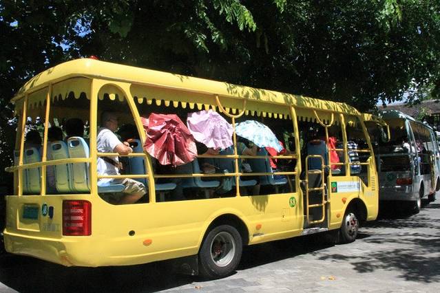 观光车,50元/人,必须坐,如果走路上的话可能要4、5个钟头才走的完。还有一个比较有趣的地方,就是上山的车和下山的车交汇时,车上的人就要大声的跟另一