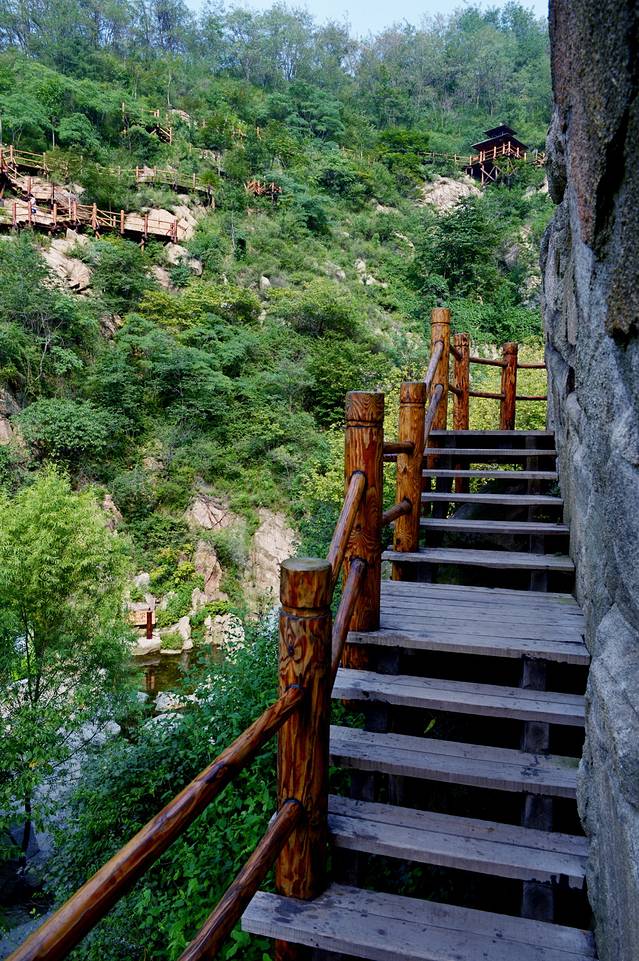 咳、咳、言归正传。购票,检票,穿过庭廊,听到阵阵水声,这应该才算走进了九如山吧。早就听说九如山爬山是走栈道,今天走上来才真正体会到与登山的石台阶的差别来了,最明显的一个感受就是这里爬山没有那么累,木质的栈道,相对石质台阶来说比较有弹性,走在上面不是特别累,家里老人很喜欢这种方式;再一个就是这老板太给力了,在悬崖峭壁上建栈道,这难度可不是一般大,没有多少人有这么大的魄力完成这么大手笔的建设,我开始对这个景区刮目相看了。听讲解员说,这些栈道全部使用原木搭建,曲曲折折的足有十公里长。