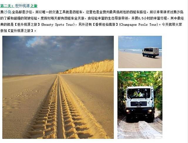 费沙岛全岛都是沙径,所以唯一的交通工具就是四驱车,这里也是全澳州最具挑战性的四驱车路径,所以非常讲求对费沙岛的了解和超强的驾驶经验。度假村每天都有四驱车全天游,由经验丰富的生态导游带领,开展8.5小时的丰富行程,其中最经典的就是【世外桃源之旅】(Beauty Spots Tour),另外还有【香槟池仙境游】(Champagne Pools Tour)。今天就带大家参加【室外桃源之旅】。