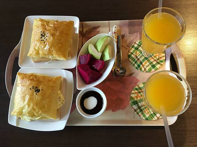 为了看日出日落定了海景房,谁知天公不作美,在垦丁的两天落山风差点把我吹去太平洋lol。。。说实话,这里的交通不是很方便,距离大街和玩水的地方都有一定距离。不过管家姐姐很热心,每晚会免费送我们到大街,然后定好时间再接我们回去。另外也很热心的帮我们订车票、联系一日游,关键是:早餐超!好!吃!面包外皮酥脆,里面松软,牙套妹表示吃起来毫不费力!炒蛋滑嫩,还有新鲜的果汁,用金姐的话说,完美!