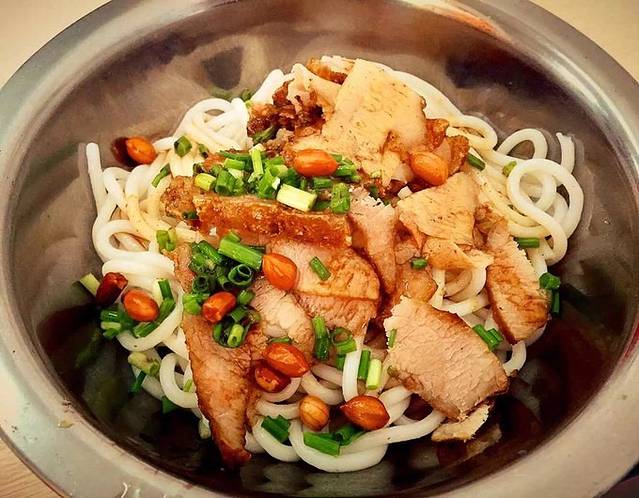 说起桂林的吃,首当其冲的当然是全国都开有连锁店的桂林米粉了,如果你以为这儿的味道和你在其他城市吃的是一样的,那就大错特错了。真正的桂林米粉精髓有三:1.粉,要新鲜的,当天做了当天吃。口感为韧性中带一点脆,带一点点糯。2.卤水,桂林米粉大多为干拌的,卤水每家熬制的味道有区别,但总体还是有桂林的味道。卤水熬制的原材料有几十甚至上百种,味道香,口感饱满。3.配料,主要的配料有锅烧(油炸的连皮带肉的一种东西),卤牛肉或者叉烧,葱花以及各式各样的腌制的酸菜。另外,在桂林的米粉店,一般面积都很小,桌椅数量也少,经常摆到马路上,甚至也不够,所以在桂林一个非常有意思的现象就是,清晨一堆人站着或者蹲在马路旁,每人手里都拿着上面印着“消毒中心提供”的黄色大碗,一起吃米粉。