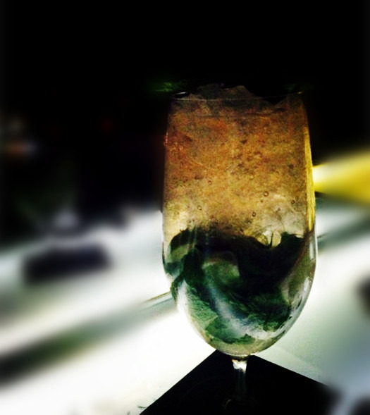 莫吉托尝了两口,整体出奇地容易入口,非常讨喜;外观上也很漂亮,下面是翠绿的薄荷,上面的酒体竟然是粉红色,尝起来有点梅酒的味道。Sazerac是挺少的一杯,但是是烈酒,只能小口小口喝。这个酒应该是历史上有记录的最早的鸡尾酒了。成分是干邑或者黑麦威士忌,问了服务生,他说店里用的是后者,放了柠檬皮并掺杂了苦艾酒和苦精,做法很正宗。