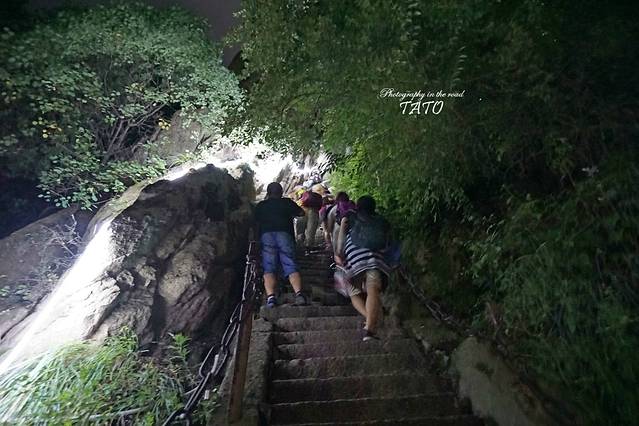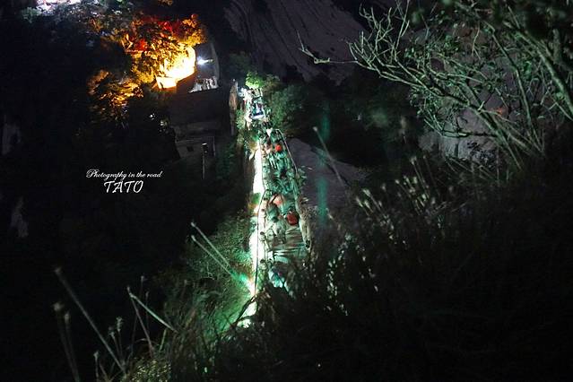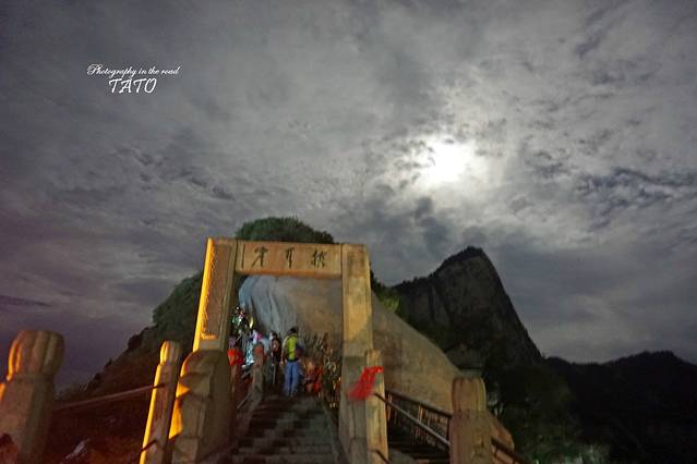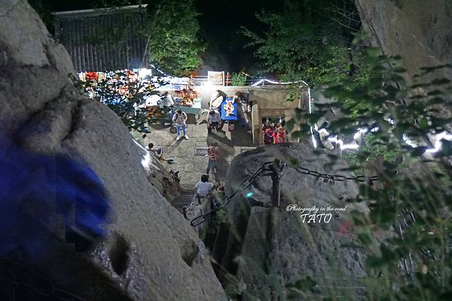 苍龙岭,这里会出现两条路了,不过基本上都是选择右侧的一条道上去的,当然我们跟随人群走的右侧道路,又是一条长长的连续攀爬的阶梯,虽然没有之前的千尺幢那么倾斜,但是到了这里体力已经消耗大半了,行进的速度已经很慢了,很多人就直接是坐在半路上休息了,说实话有点妨碍交通了。之前还只是在山腰上攀爬,苍龙岭就真的是在山顶上了的,从这个山头横跨至那个山头的道路,估计此时的两边应该都是悬崖吧,不过还是那句话,幸亏是夜爬,根本看不见。