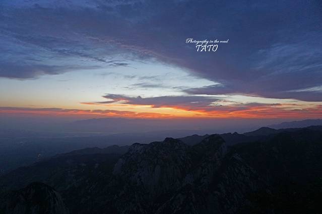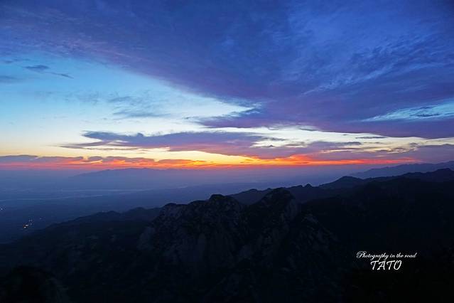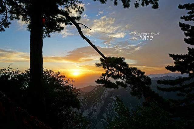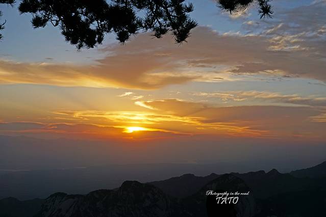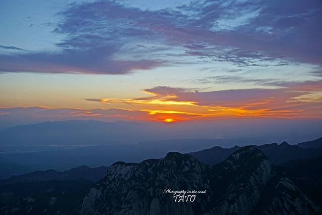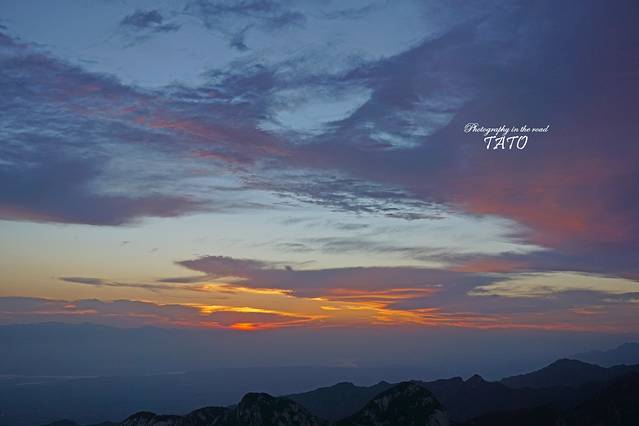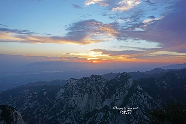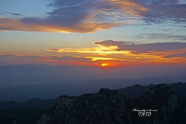 五点半开始,日出的过程非常的快,一瞬家就结束了,这样的日出也是非常的漂亮,霞光普照,因为前几天一直在下雨,能够看到这么样的日出,确实是老天的惊喜了。这是人生当中第二次看日出,第一次是两年前在纳木错,因为这次是很辛苦的爬上华山才看到的,所以更加觉得动人,把这个保存在记忆中吧,照片永远也无法保存真实的当时。相比日出,朝霞的前作反而出乎意料的美丽,旅行就是体验不一样的生活嘛,这趟华山值了。