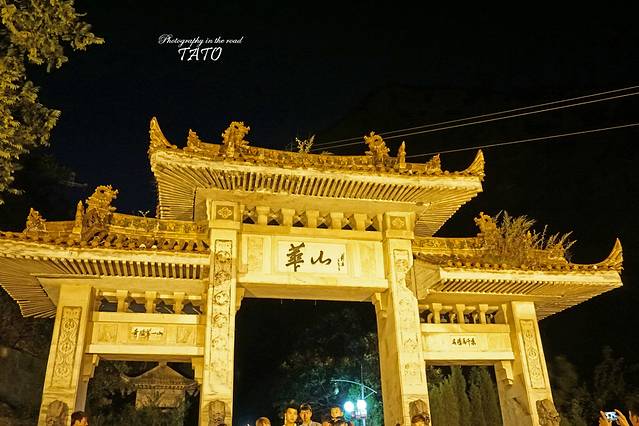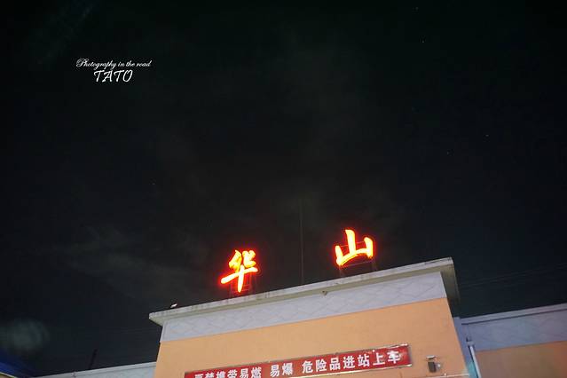 检票出站,车站外面就已经等候着很多的人了,阿姨大婶涌上来售卖手套和手电头灯的,大叔小哥开着私家车拉客的,因为是晚上只能打的去景区了,于是我们问了一个私家车的大哥,一辆车40元,我们两个人,可以再找两个人一起拼车去景区,我们觉得价格还OK,就在人群中又找到一个姑娘,然后本来想再找一个人的,结果大哥催促我们快点,好吧,我们三个人就坐上车走了,车站外面也有TAXI,价格我们也没问,或许价格更优惠。上车之后跟大哥开玩笑,催我们这么急干嘛,因为这个点把我们送到景区之后,可以回来火车站再拉一趟,再晚些就没人了,和大哥闲聊,其实这里就是一个很小的小镇,叫孟源镇,以前这个火车站是孟源火车站,后来才改名叫华山车站的,都是因为华山旅游兴起的,夜爬华山的人有很多很多,因为前几天都是下雨的,今天的天气好些了,晚上的游客也很多,大哥还和我们说上山注意点,带上手套手电,在山脚下吃饱饭再上山,经过了宝莲灯广场也就是游客中心,白天一般都是在这里出发的,晚上的话,我们直接到的玉泉院出发,从火车站到玉泉院,大概二十分钟。