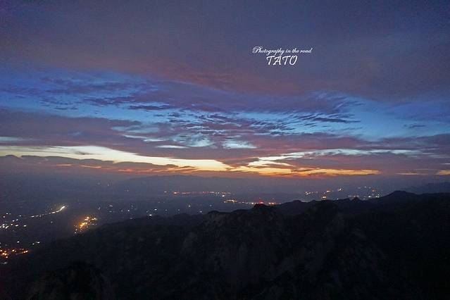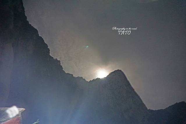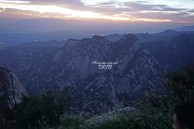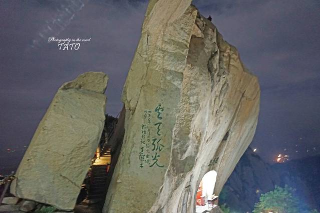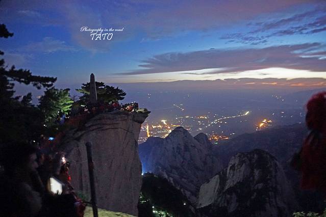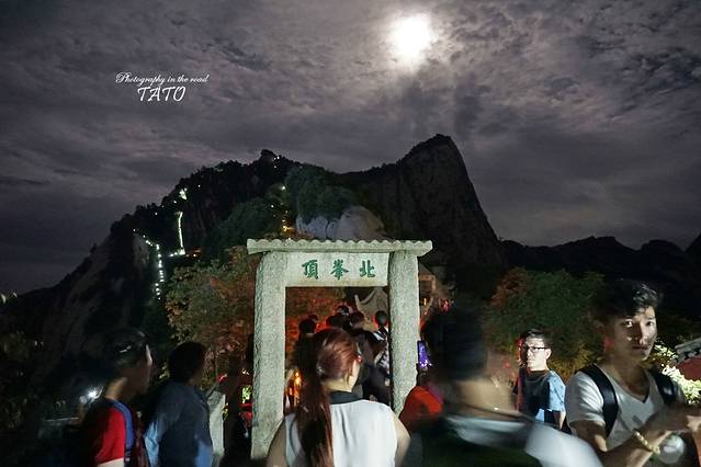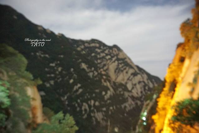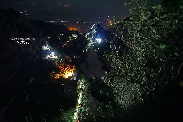 前面有房子的那里就是北峰顶了,而白色灯光那里就是北峰索道了,那么亮的灯光,生怕我们不知道你的存在吗,可惜晚上又没有运营,要是晚上也运营的话,夜爬华山的人不得挤爆啊。