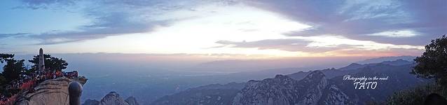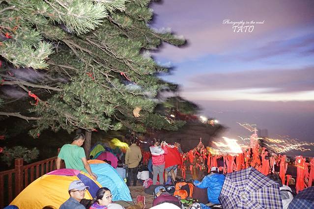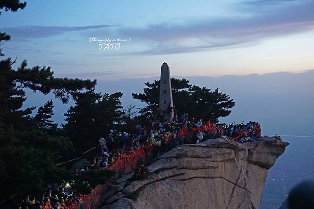 经过百步云梯就到达东峰了,看日出的最佳地点,亦称朝阳峰。三点多到达,已经有很多的人了,山边上长长的用木板铺成的通道上挤满了人群,大家都在休息,吃东西补充能量,看电视,聊天的,很有各种装备,军大衣出租50元,自己带帐篷的,在金锁关附近也有出租帐篷的,50还是100元忘了。而我们呢,我就是一件短袖加一件薄薄的防晒服,我朋友就是一件短袖加衬衫,在爬山的过程还不会感觉冷的,到了山顶休息了,就很冷了,而且还四处有风,我们只能靠在一起稍微眯了一会儿。