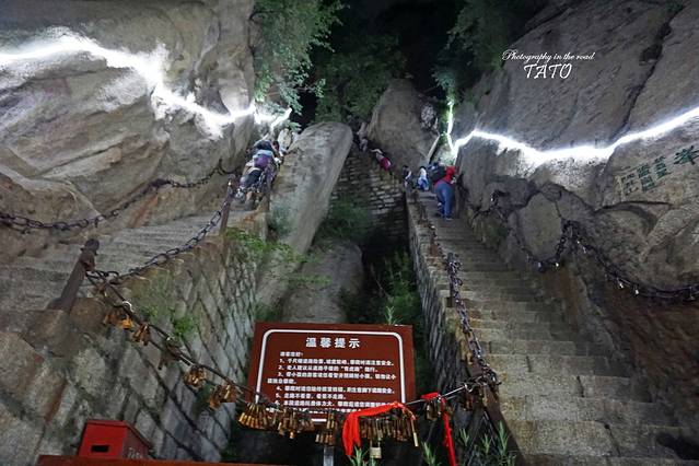 金锁关,两点半到达,很多人在这里休息,也是有买东西的地方,这里过去就快到达东峰了,我们看日出的山头,这里出发又是两条道路,右侧是通往西峰的,左侧是通往东峰的,反正跟着人群走就是没错的,但到了这里人群已经不像是之前那么多了,而且路上的灯关也减少了,所以在这里行走要更加注意安全了,这段路稍微平坦些了,到达东峰最后的一个险要关卡就是百步云梯了,倾斜角度完全可以用垂直下上来形容了,为了寻求刺激,倒是很多人尝试,很多的人在排队,因为到了这里大家的体力都已经消耗的差不多了,再这么攀爬,速度是很慢很慢的,自己也很想尝试,但是这么多的人在这里排队,算了还是直接奔向峰顶吧,当然边上还有另一条道路的,就看着别人爬了一会儿,真的各种尖叫声,还有哭声,都是勇敢的了,在挑战自己,因为我们都是从山脚下爬上来的。