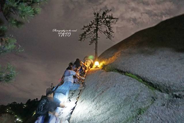 照片上勉强能看的出前面的人群吧,千尺幢最多也只能供两人并行的,买手套的作用就是用来抓这些铁锁链的,对于我们这种皮糙肉厚的,手套好像并用不着的。还好是晚上爬,周围漆黑看不见,当然路线上是有路灯的,而且有这么多的人,所以感觉不到这个关卡的险,不过很长,而且倾斜,爬上去还是很累人的,所以要抓紧铁锁链,注意安全。