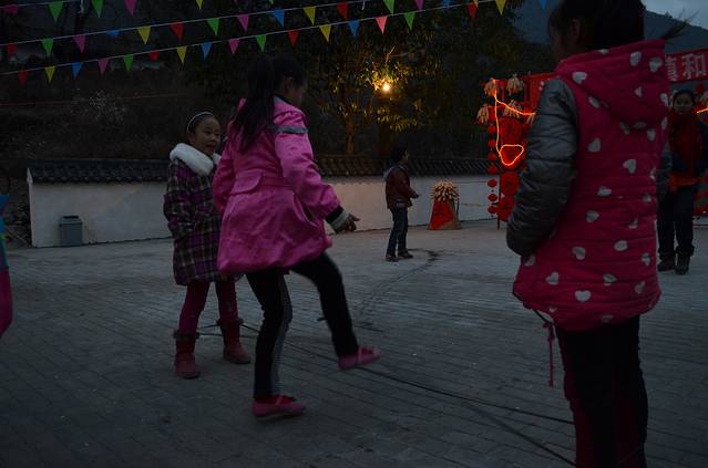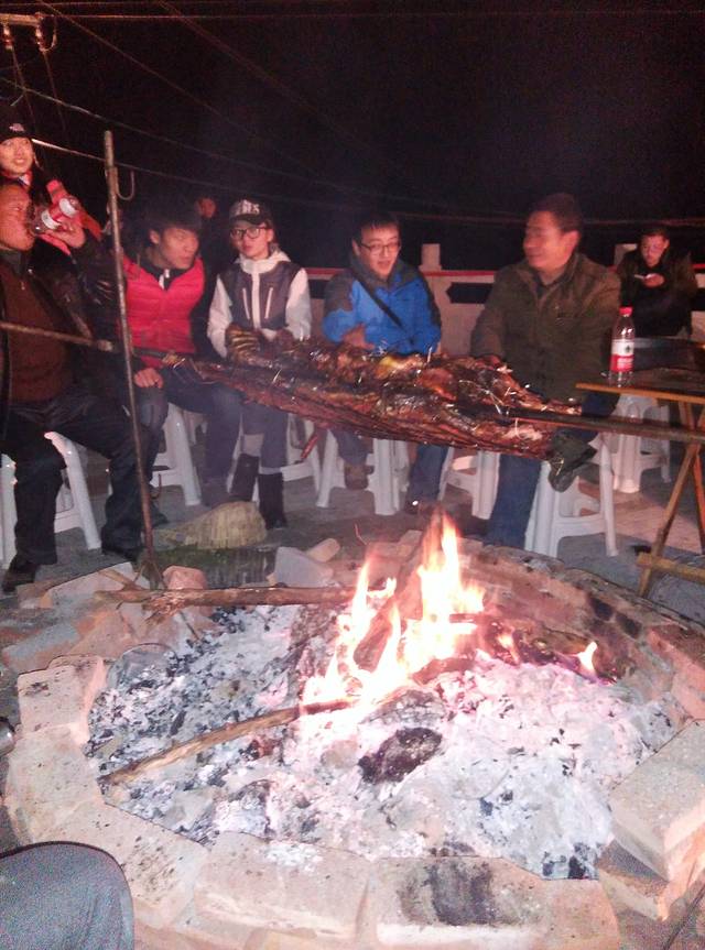 只看见,一群人坐在篝火旁边,围了几圈,中间架了很多木材,已经快要成型的烤羊在上面翻滚着,油吱吱地往下掉,混着人声,让人即温暖又垂涎欲滴。赶紧找了一个位置坐下,开始和当地人摆龙门阵。突然看见几个小朋友在跳橡皮筋,想当年,我可也是此项运动的高手,立即决定加入他们。小朋友们也挺热情的,我们马上分成两组对决,没想到,时过多年,我的水平还是很高的,每级自己过关后,还要帮和我一组的两个小妹妹跳一遍,拯救他们。我就这样连续跳……“小燕子飞飞,五阿哥追追,可怜的尔康爱紫薇,香妃跳舞皇上看,容嬷嬷是个大坏蛋”,哎呀妈呀,太累了……不行了,我得回去吃饭了,晚上再来,结果,错过了吃饭时间,就一边在门口烤火,一边等军嫂给我们开小灶。