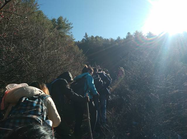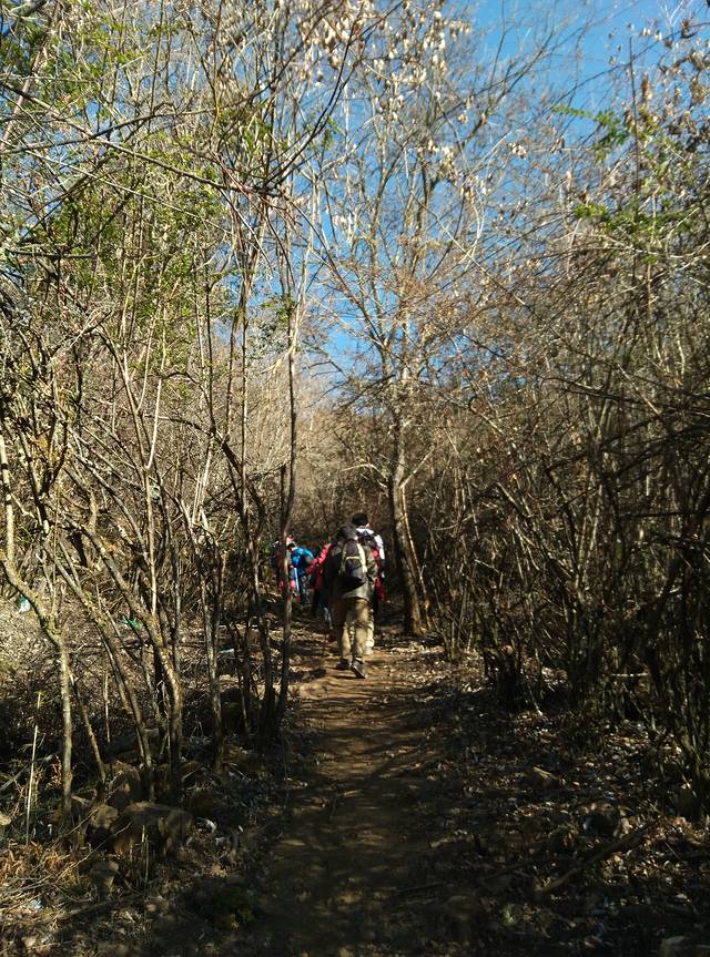 11点半了,从刚才一段连续的上坡后,再走一段平路,就到了中间休息站,街心花园。往后一看,自己都爬了这么高了,有点佩服自己了!六个小伙伴终于走到了一起,小林子继续往上走了,还有一个胖胖的王老师,好像还没到。孙婆婆是一路上郊游上来的,不停地吃东西,到处发吃的,现在手上还拿着一包零食呢,在路上的时候,大家都累得气喘吁吁了,没空理他。创可贴也走得慢,听说在后面让专业的摄影师王老师给他拍照,哈哈!一群拿着登山杖的逗逼,有一种闯荡江湖的感觉,哈哈!