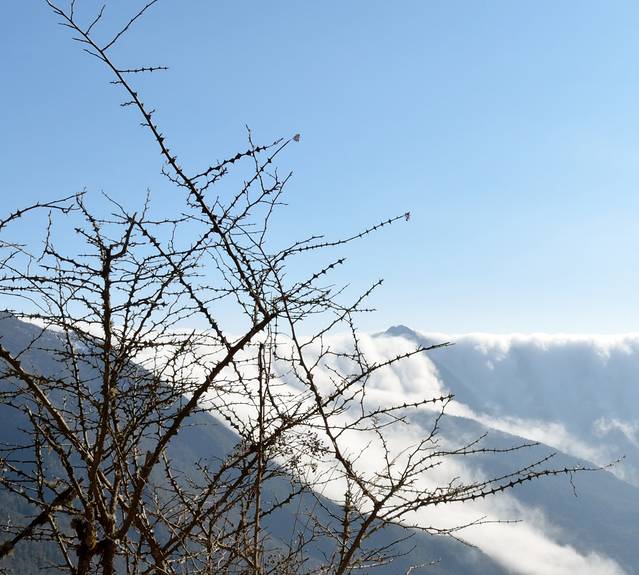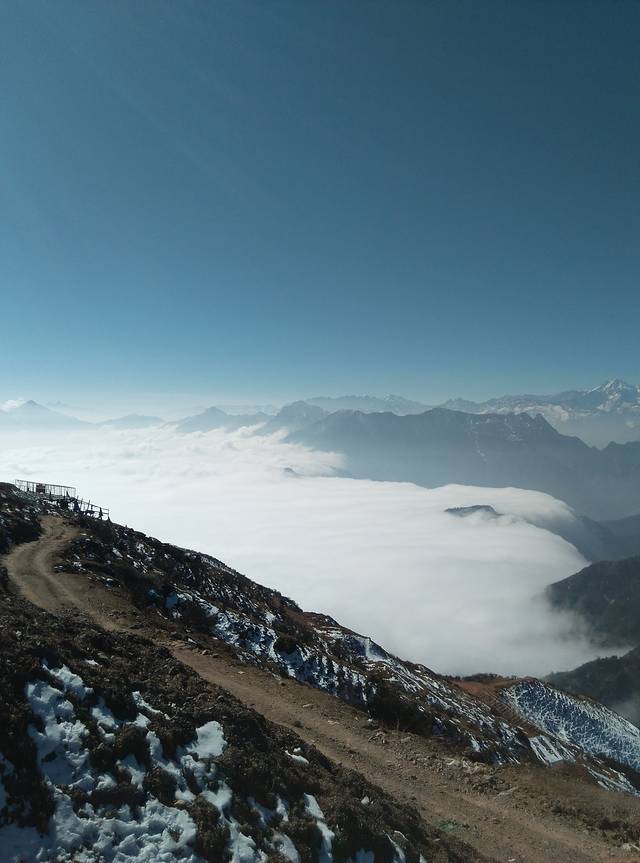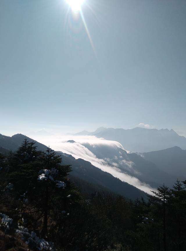 原计划是,徒步上下山的,但是,我这个鞋子,要走下山,还不如找个雪橇来滑下去,为了自己的安全,我选择了坐车下去,一直等到下午1点多记得那晚,寒风嗖嗖,一群人还是热情不减:“嘿,兄弟,你那个参数怎么调的”“我看看你拍的照片”才有下去的车,其他的车早就被订完了,也正是这个意外,游客散尽后,才安下心来,好好欣赏了一下牛背山,阳光360°无死角照耀在每一寸光秃秃的土地上,走在上面,我还是觉得很冷,举目四方,还真有一种在天宫的感觉。下面的云浓郁又扑朔,连绵不绝,又从某处倾斜而下,让人不得不赞叹大自然的神奇。