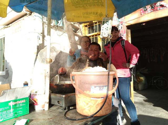 没走一会儿,就可以看见轮椅小哥开的小店,买了一份土豆,5元,还送了莽子一个鸡蛋。莽子正举起鸡蛋和轮椅哥合影呢!
