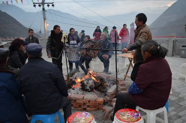 我们几个小伙伴在烤羊肉旁边又围了一圈,一起喝当地人晾的包谷酒,几个当地人也加入了我们的阵营,这就好玩了。一位大爷先举杯,念了一长串敬酒诗一样的话,最后一句“今朝有酒今朝醉”大家一起,举杯,“对,今朝有酒今朝醉”,喝完酒,我们和村民就来互出节目助兴。老爷爷倒是很积极,唱了很多文革时候的歌和这边的山歌,我们也没有示弱,陕西小林子的《映山红》也赢得阵阵掌声,我也上去舞了一段。这是,另一个主角又出现了,我们叫她“张孃孃”,她的组织能力也是无可匹敌呀,把在我们身边转悠的当地的各种官和村民都叫来表演节目,还知道我们怎么起哄,哈哈!每次喝酒前,她都举起杯子,说:“我本来是不喝酒的,今天高兴”然后,一饮而尽。这是,老爷爷也会举杯,用一口正宗的川普说:“我提议,我们来喝一杯。”这两个搭档也是绝配。村花和张书记都被叫过来唱歌了,张书记一首《传奇》更是带走了小林子的心,哈哈,小林子高兴起来,说要在这里安家,孙婆婆听到了,就四川打听,看能不能给她找个婆家,结果,遇见了张书记,从此,小林子和张书记成了我们永远说不完的话题……
