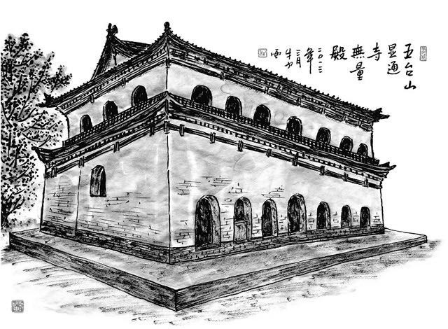 无量殿通体白色,四壁全用青砖砌成。殿顶是重檐歇山式,用方木殿内无大梁、无立柱,殿外无廊檐,因此人们又叫它“无梁殿”。
