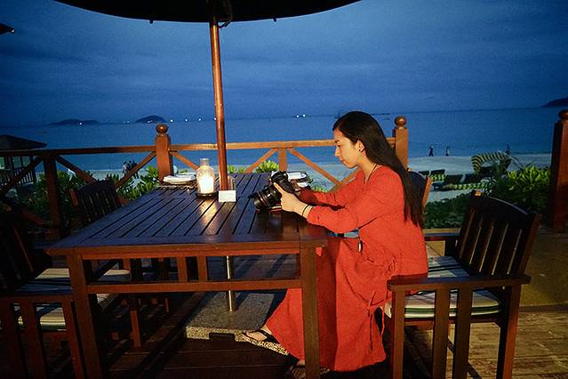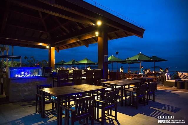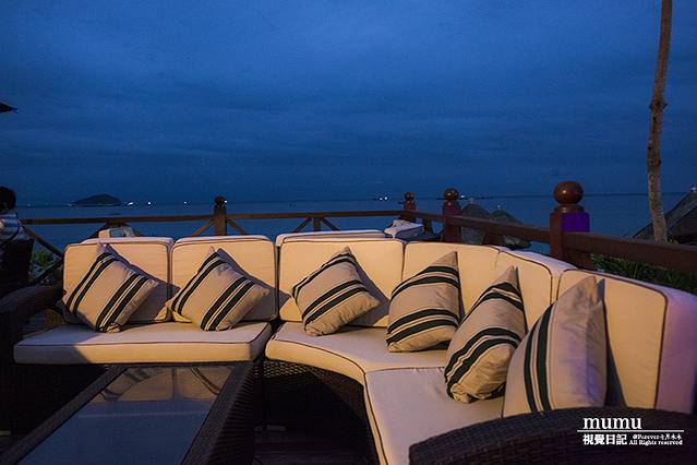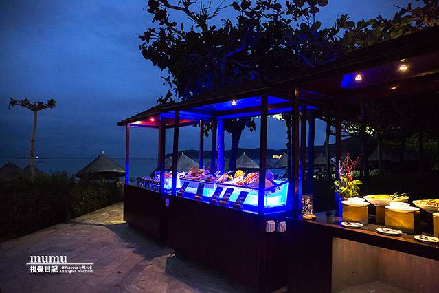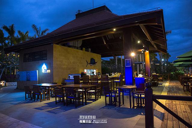 鱼吧是亚龙湾万豪海边餐厅,除了供应海鲜火锅之外,周六晚上也会有音乐烧烤,而我们入住这天正好周六。天色渐渐暗下来,蓝与色冷暖色的结合迷人色调,相机总能拍出一些人肉感感知不到的东西。